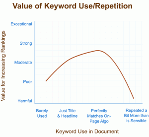 上图中内容大概是这样的:关键词只要出现了就有一定效果,在一定范围内出现频率越高,效果越好。但超出这个范围以后,对排名的效果会以更快的速度回落。(这个范围不是很清楚,图中的英文单词还需高手解答一下。)所以可以看出,过尤不及,关键词适当的出现次数是最好的。