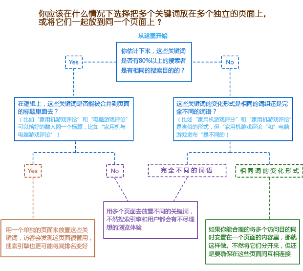 这个图片告诉我们关键词该如何部署,当网站有一堆栏目,什么栏目应该和其他栏目归并起来,又什么栏目应该分开?上面一张图较好的解答了这个问题,也不再多做阐述了。总之搜索引擎会基于它的用户的角度出发,努力让搜索者获得最好的搜索体验,所以大多数情况下,出于用户体验优先的考虑会更有助于SEO。